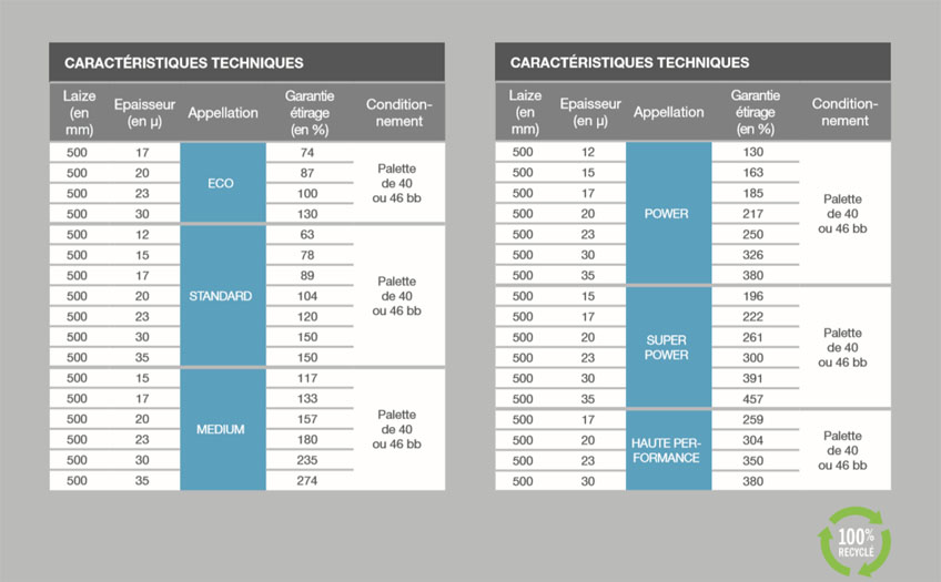 Film disponible en 5 qualités différentes pour rencontrer tous les besoins, des plus courants aux plus spécifiques en termes d'utilisation et d'étirage : standard, medium, power, super power et haute performance (cast opaque pas dispo en version Eco).