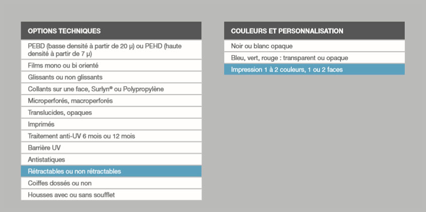 Les housses de protection opaques PEBD (polyéthylène basse densité) sont disponibles à partir d’une épaisseur de 20 µ.